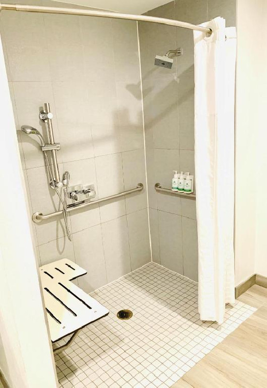 • Roll-In Shower That Is Free Of Curbs Or Lips At The Shower Floor Thus Allowing Wheelchair Approach And Transfer Onto The Folding Shower Seat; in addition, Free Of Doors That Would Impede Wheelchair Transfer Onto The Seat, Horizontal Grab Bar On The Wall Opposite The Seat For Stabilization And Aid In Maneuvering While In A Shower Wheelchair, Faucet Controls And Shower Wand Positioned On The Wall Along The Side Of The Shower Seat So They Are Operable From The Folding Shower Seat or From The Shower Wheelchair, Roll-in Shower Has A Securely Fastened Folding Seat At 17"-19" Above The Floor Onto Which Persons Who Use Wheelchairs May Transfer To Shower